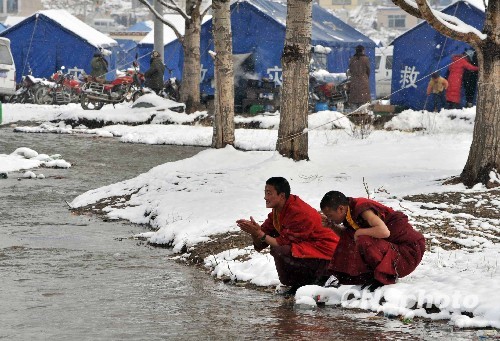 4月22日清晨,青海省玉树地震灾区一夜风雪,当地僧侣们在玉树河边洗漱。中新社发 贾国荣 摄