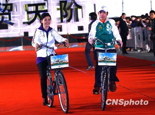 4月22日晚,一场由著名导演冯小刚亲自操刀导演的“8℃·北京旋绿——2010世贸天阶低碳之春明星演唱会”在北京世贸天阶广场巨型“天幕”之下举行。陈道明、张国立、徐帆、黄晓明、羽泉、张靓颖、阿杜、郭峰、陈楚生、李健、杨坤、田亮悉数到场。红地毯环节更是别出心裁,明星们骑着自行车出场,身体力行地表达对城市低碳环保事业的关注。图为冯小刚、徐帆骑自行车恩爱亮相红毯。中新社发 李学仕 摄