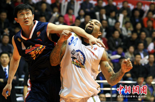 4月22日晚,2009-10赛季CBA总决赛进入第三场角逐,新疆广汇主场迎战广东东莞银行,比赛异常激烈,最终广东东莞银行116-112战胜新疆广汇,广东队以总比分3-0领先。图为新疆广汇队查尔斯与广东东莞银行队杜锋再次相遇,互不相让。