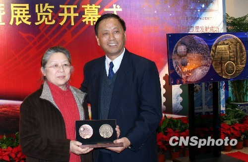 图为中国航天集邮协会会长吴卓(右)向来宾赠送专门制作的“永远的东方红”大铜章收藏品。中新社发 孙自法 摄