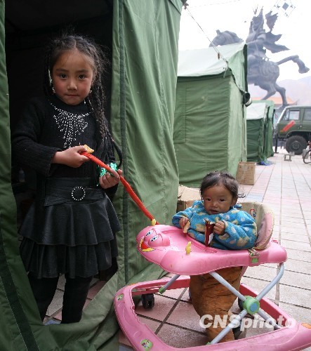 “4.14”青海玉树7.1级地震发生以后,很多孩子失去了家园、父母,但灾区的孩子们依然坚强乐观。图为姐姐带着妹妹正在帐篷家门口玩耍。中新社发 刘忠俊 摄