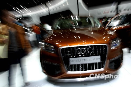 4月23日,以“畅想绿色未来”为主题的2010(第十一届)北京国际汽车展览会正式开展。本届车展共有来自16个国家和地区的2100余家厂商参展,展车共计990台,其规模是全球最大的一次车展。图为中国市场最热销的奥迪Q7型高级轿车受青睐。中新社发 赵振清 摄