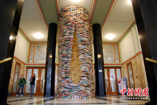 喜欢读书的捷克人在布拉格市立图书馆入口处用8000多本图书堆积起一个柱型雕塑,它高5米,并有一个奇特的名字叫“习语”。黄频 摄