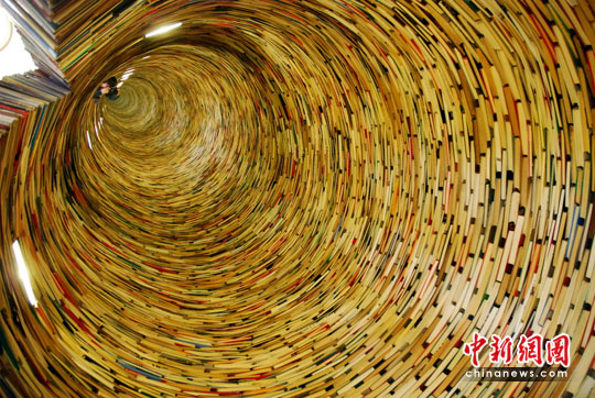 雕塑“习语”内部呈井状,顶底装有镜面,探头张望,书井内壁映射出成千上万册图书,展现了一个奇丽无比、令人无限向往的图书世界。黄频 摄