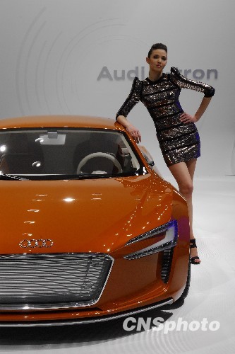 4月23日,2010年北京国际汽车展迎来媒体接待日。奥迪汽车公司展台上展出的R8高级跑车与靓丽的模特同台亮相。中新社发 侯宇 摄