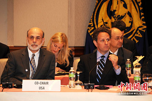 图为美联储主席伯南克和美国财长盖特纳出席当天的会议。中新社发 吴庆才 摄