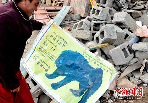 玉树一个藏獒养育地完全被地震摧毁,废墟上残留着广告画。贾国荣 摄