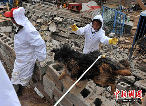 防疫人员走家串户密集收集藏獒遗体。贾国荣 摄
