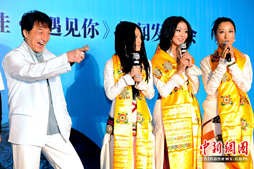 4月24日,阿佳组合全新国语大碟《遇见你》在北京召开记者会,国际巨星成龙亲自到场祝贺,并与阿佳组合共同献唱。阿佳组合成员是三位藏族美女,她们以藏语高音、载歌载舞的风格掀起了流行乐坛民族风。成龙受邀和阿佳合唱了公益歌曲《呼唤》和《爱飞翔》,后者更是成龙首次尝试的藏语歌曲。