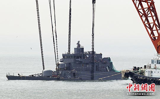 4月24日,韩国军方打捞人员将上月沉没的“天安”号警戒舰舰首残骸成功打捞出水,同时找到一具遇难者遗体。