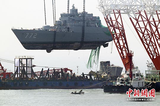 图:韩国“天安”号舰首残骸被打捞出水(2)