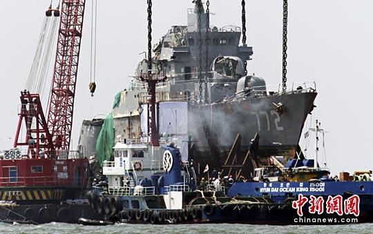 图:韩国“天安”号舰首残骸被打捞出水(3)
