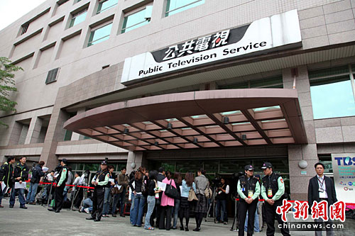 该辩论会吸引了近百家媒体的200多名记者报名采访,大批警员在公视大楼内外戒备。董会峰 摄