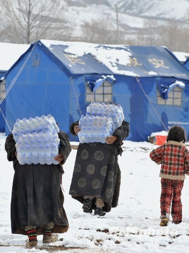 两位玉树地震灾区的藏族母亲各领到两大包饮用水,背回救灾帐篷。各界赈灾的大批救灾物资连日源源不断运抵灾区,青海省玉树抗震救灾指挥部负责人26日表示,已收到捐赠资金近35亿,救灾物资折价近40亿。中新社发 贾国荣 摄