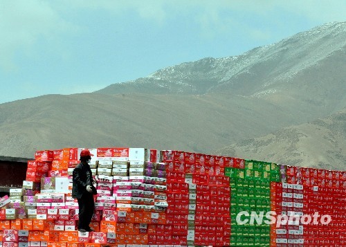 一批赈灾食品运抵玉树清点后准备立即发放。青海省玉树抗震救灾指挥部负责人26日表示,已收到捐赠资金近35亿,救灾物资折价近40亿,中央财政分两批安排5个亿。现在社会各界、国内外各个方面的捐赠还在继续进行。中新社发 贾国荣 摄