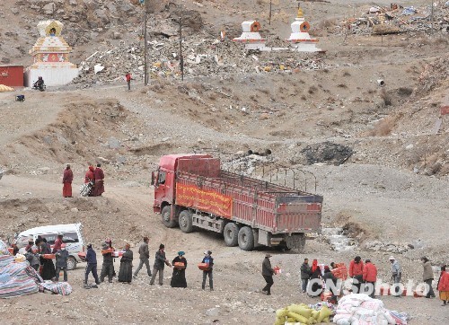各地赈灾食品正源源不断运抵玉树,一个藏族村寨正清点发放。青海省玉树抗震救灾指挥部负责人26日表示,已收到捐赠资金近35亿,救灾物资折价近40亿,中央财政分两批安排5个亿。现在社会各界、国内外各个方面的捐赠还在继续进行。中新社发 贾国荣 摄