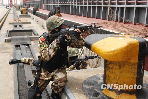 4月26日下午,江苏省交通运输厅和武警江苏边防总队联合口岸单位在南京龙潭港码头模拟“偷渡事件”、“劫船事件”等实战演练,检验和提高港口安保的反应能力和实际操作水平,以切实维护口岸出入境正常秩序,确保上海世博会期间南京港口岸安全稳定。中新社发 江法 摄