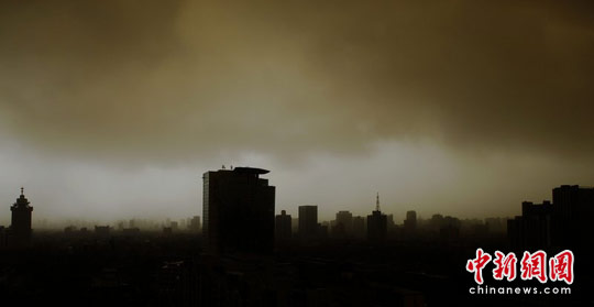 2010年4月26日下午14时,石家庄遭遇沙尘暴袭击,沙尘伴随大风由西向东刮来,市区上空黄白分明。张润民 摄