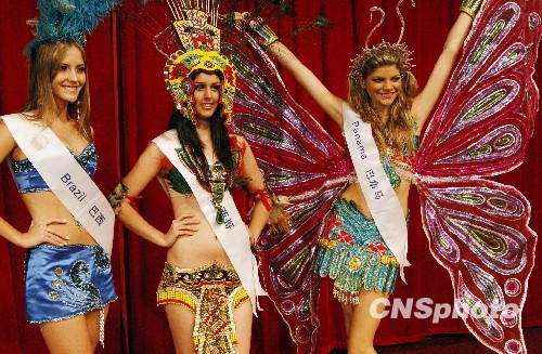 4月28日,2010年度全球小姐国服总决赛暨全球中国小姐总决赛在中国湖南张家界市拉开帷幕,来自美国、加拿大、委内瑞拉、墨西哥、巴西、加纳、喀麦隆、英国、法国、韩国、泰国以及中国等56个国家的56位佳丽汇聚风景如画的张家界,在自然山水间展示青春魅力。图为2010年全球小姐各国参赛佳丽展示风格各异的国服。中新社发 钱兴强 摄