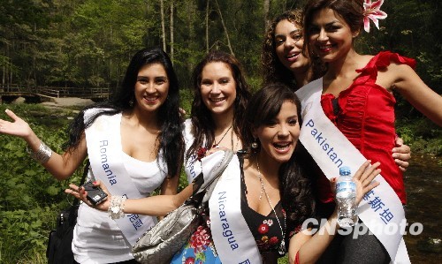4月28日,2010年度全球小姐国服总决赛暨全球中国小姐总决赛在中国湖南张家界市拉开帷幕,来自美国、加拿大、委内瑞拉、墨西哥、巴西以及中国等56个国家的56位佳丽汇聚风景如画的张家界,在自然山水间展示她们的青春魅力。图为全球小姐各国参赛佳丽来到张家界国家森林公园游览拍照。中新社发 钱兴强 摄