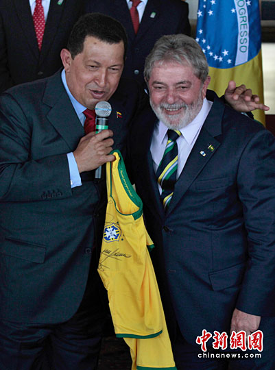 图:巴西总统卢拉向查韦斯赠球衣(2)