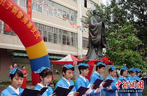 4月29日,广西大学生在孔子铜像下诵读《论语》。中新社发 黄艳梅 摄