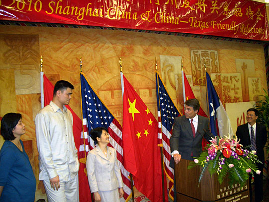 中国驻休斯敦总领事高燕平和美国德州州长瑞克-佩里在休斯顿总领事馆共同举行招待会,姚明夫妇应邀出席。(美国《华夏时报》/丹阳 摄)