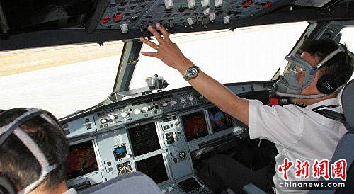 图为玉树机场RNP试飞机组在着陆过程中佩戴上氧气面罩执行任务。中新社发 易世忠 摄