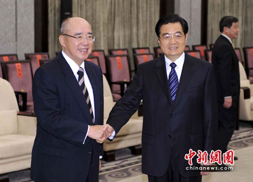 胡锦涛与中国国民党荣誉主席吴伯雄握手。中新社记者 廖攀 摄