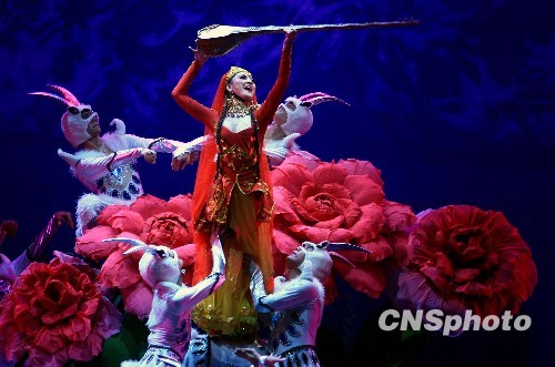 4月28日晚,新疆首部大型民族风情音画剧《美好家园》在新疆艺术剧院首次公演。《美好家园》全剧长80分钟,分《天石之灵》、《天池之恋》、《天山之鹰》、《天城之火》、《天佛之洞》、《天漠之魂》等8个篇章,利用现代舞台的声光技术,创造了一个梦幻般的世界,将最神秘、最传奇、最美丽的新疆展示给观众。中新社发 刘新 摄