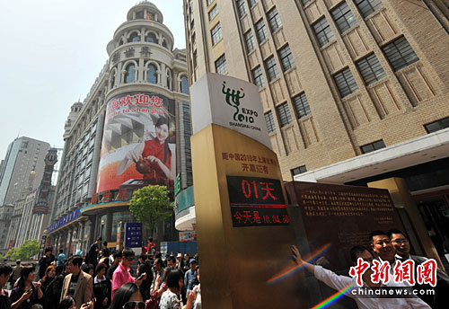 4月30日,在上海南京路的世博会倒计时一天标牌前,人们纷纷拍照留念。中新社发 贾国荣 摄