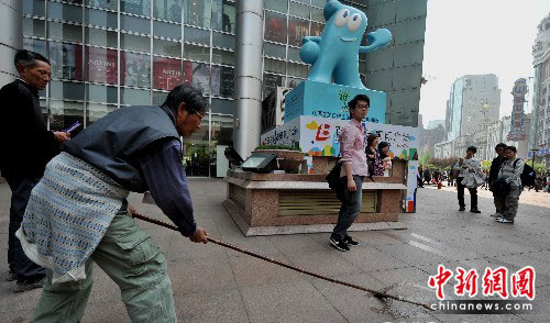 4月30日,一位街头画家在上海街头的世博会吉祥物海宝旁用自制的毛笔蘸水在地面上画行人素描,为举世瞩目的上海世博会今晚在黄浦江畔开幕助兴。中新社发 贾国荣 摄