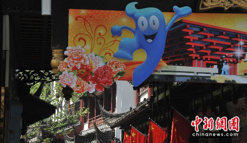 4月30日,举世瞩目的上海世博会将在黄浦江畔开幕,吉祥物海宝在豫园街头大展英姿,迎接五湖四海的宾客。中新社发 贾国荣 摄