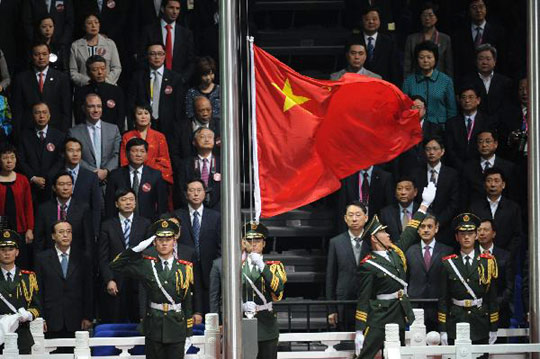 4月30日,中国2010年上海世博会开幕式在上海世博园世博文化中心举行。 图为升中华人民共和国国旗。 吴晓凌摄