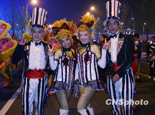 5月1日晚,上海世博会“欢乐盛装大巡游”启动。图为参加巡游的演员合影留念。中新社发 苏丹 摄