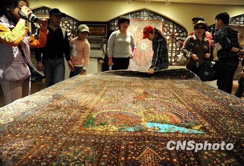 2010年5月1日,上海世博会伊朗馆开馆,喜迎各方游客。伊朗馆中最受游客关注的便是其放置于二楼的波斯地毯,据伊朗馆的负责人介绍,展出的波斯地毯累计价值达一亿多元人民币。中新社发 许康平 摄