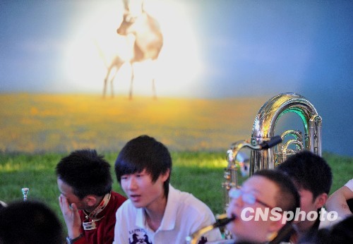 5月2日,来自玉树地震灾区结古镇的藏族小乐手巴东珠(左穿红色藏族服装者),怀着对遇难姐姐的怀念和悲痛心情来到上海世博园的中国青海馆,为观众献上一曲《在那遥远的地方》,感动全场。来上海前,巴东珠是青海省人民医院为地震伤员做藏语翻译的志愿者。中新社发 贾国荣 摄