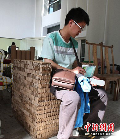图为世博伦敦零碳馆内由废旧纸箱做成的沙发。中新社发 汤彦俊 摄