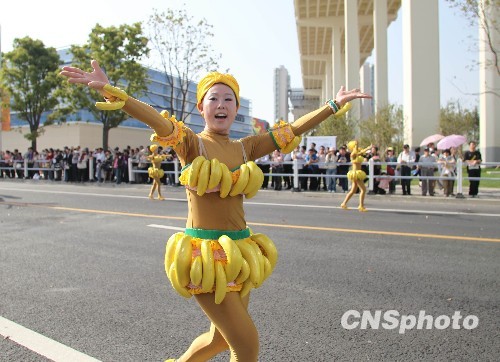 身着香蕉形服饰的演员向观众挥手致意。中新社发 苏丹 摄