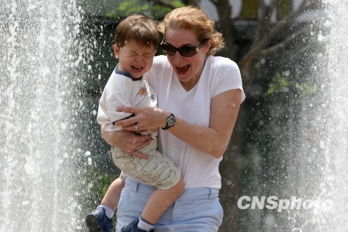 游客在喷泉水池中尽情嬉戏。中新社发 鲁谷 摄