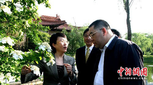 扬州市委书记王燕文(左)向澳门特首崔世安(右)特别介绍在他下榻迎宾馆门前的扬州市花。中新社发 崔佳明 摄