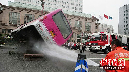 图为消防队员用水枪为公交车降温防止其爆炸,并严密监控公交车底4个硕大气瓶有无泄漏。中新社发 陈山 摄