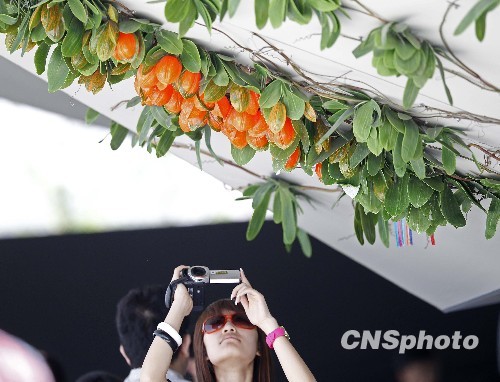 5月3日,观众在上海世博园英国馆参观未来植物——能“看病”的花儿,这种花儿遇到不同病毒会变色。这些未来植物并不是空想出来的,而是来自英国顶尖科学家们正在进行的科研项目。中新社发 盛佳鹏 摄