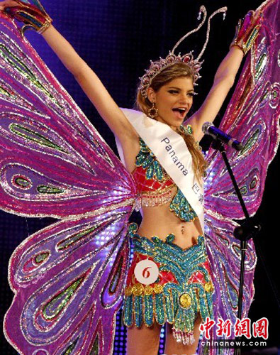 5月3日晚,2010年度全球小姐国服总决赛暨全球中国小姐总决赛在中国湖南张家界市举行,来自美国、加拿大、委内瑞拉、墨西哥、巴西、加纳、喀麦隆、英国、法国、韩国、泰国以及中国等56个国家的56位佳丽,分别展示礼服、泳装、晚装和国服,图为全球小姐各国佳丽国服总决赛展示风采。中新社发 钱兴强 摄