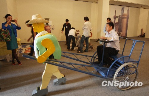 5月3日,北京通州农民发明家吴玉禄带着他的21个机器人“孩子”,一起亮相上海外滩美术馆举办的《蔡国强:农民达芬奇》全球首展,受到中外媒体关注。中新社发 吴芒子 摄
