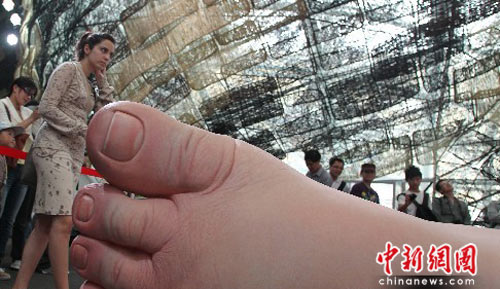 5月4日,世博会西班牙馆工作人员在巨型机器娃娃“小米宝宝”前维持秩序。这个代表未来的机器娃娃坐高达6.5米,会眨眼、会呼吸,设计者伊莎贝尔·库伊谢特表示,这一创作的灵感源于中国和西班牙文化对孩子的共同喜爱。中新社发 苏丹 摄