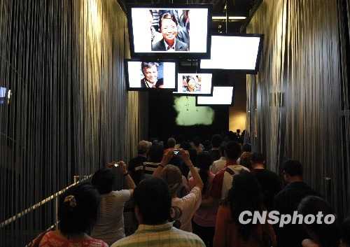 5月4日,上海世博园日本馆,馆方运用日本照相机新技术捕捉馆内观众笑脸呈现在通道里。中新社发 廖攀 摄