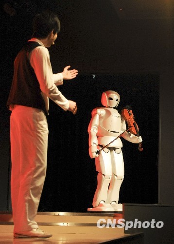 5月4日,上海世博园日本馆,主持人邀请机器人演奏小提琴。中新社发 廖攀 摄