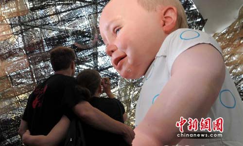 上海世博园西班牙国家馆巨型“小米宝宝”坐迎八方客,据该展馆新闻官介绍,6个月大的“小米宝宝”原名米格尔,现坐姿高度6.5米,会哭、会笑形象逼真。中新社发 陈文 摄