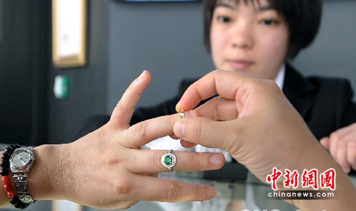 图为游客爱戴比利时钻石饰品。中新社发 陈文 摄